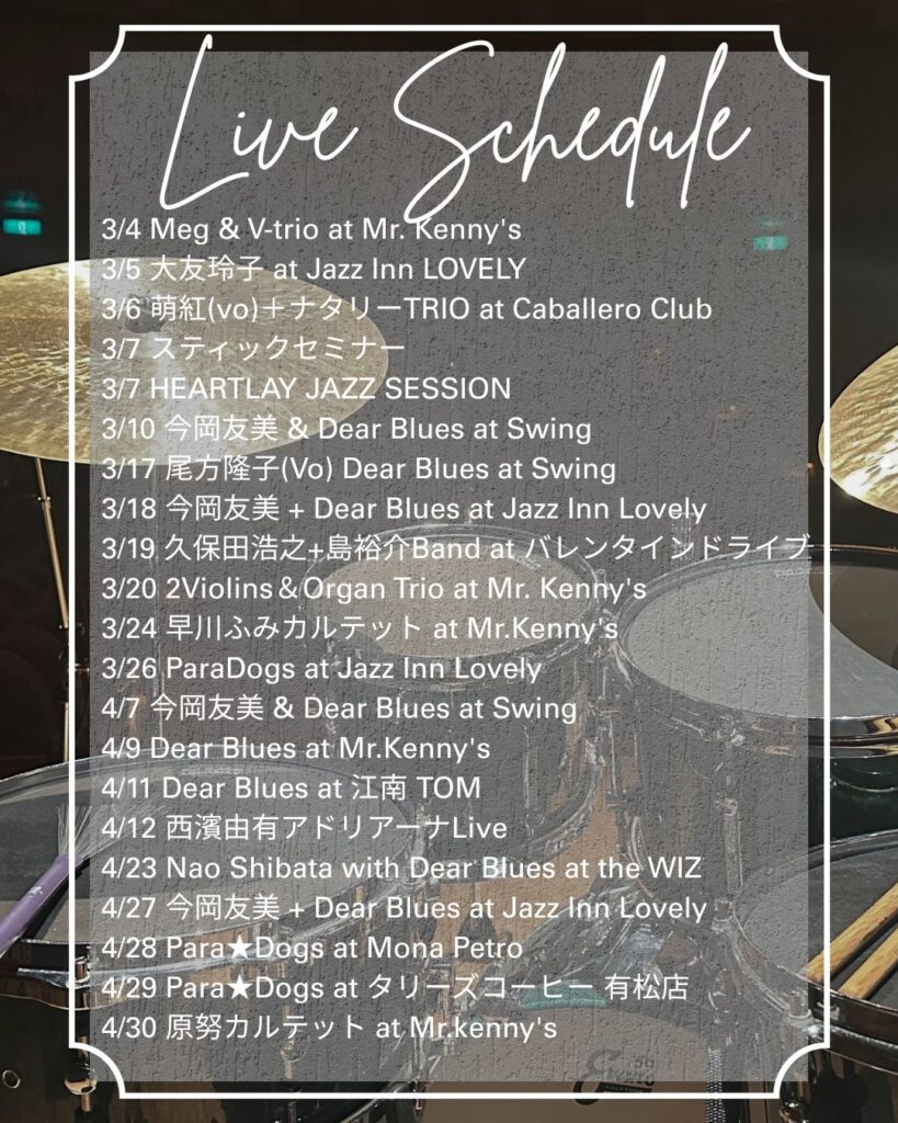 3月4月のスケジュールをアップしました。どれもとても楽しみなライブです。是非遊びに来てください!